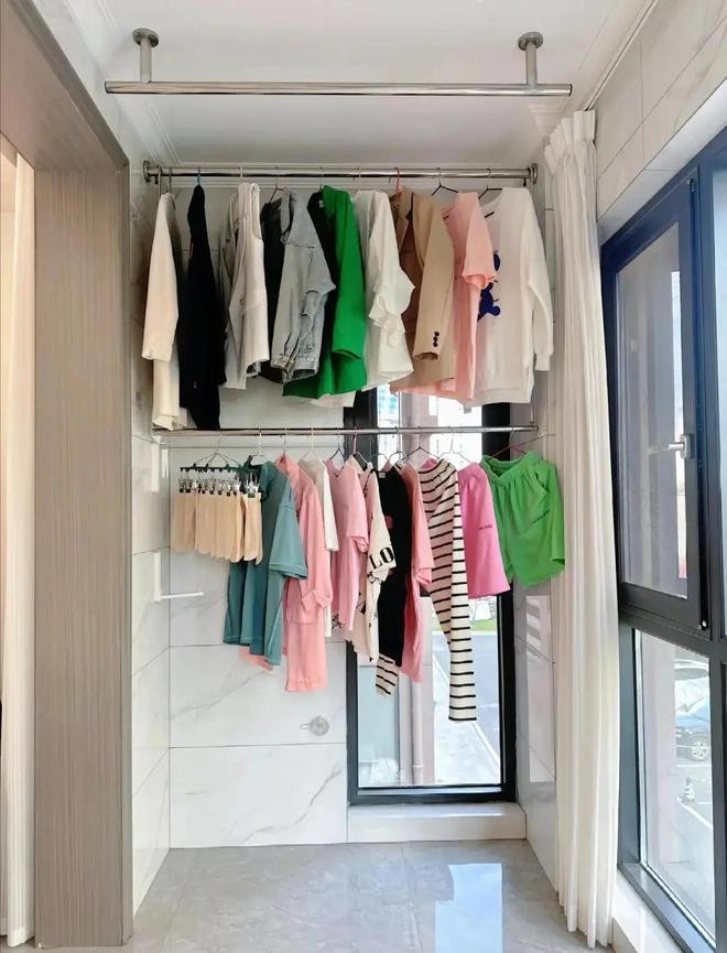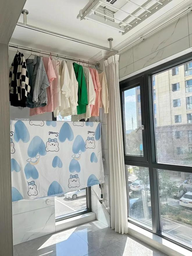 后期安装时,让师傅将其固定的阳台侧面的墙面,并且晾衣架离墙约 30-40 厘米,留出足够空隙,不影响阳台门开关和日常走动。