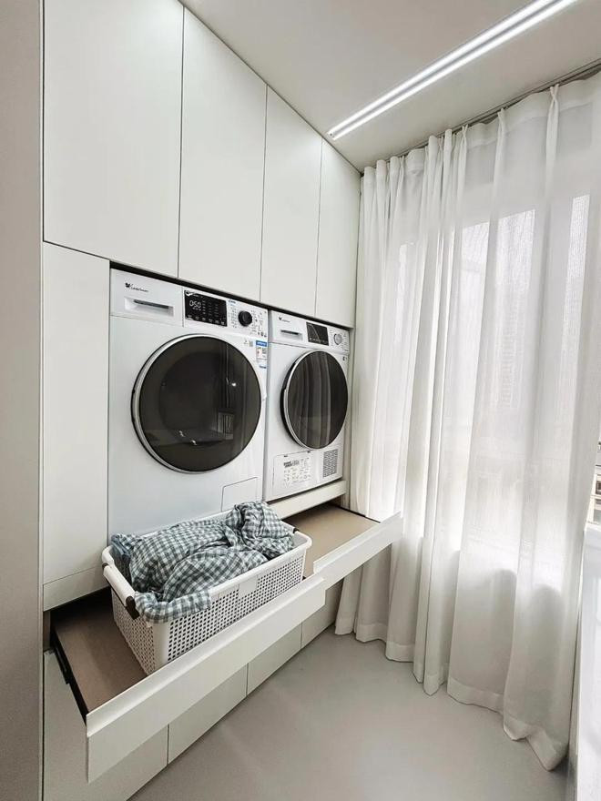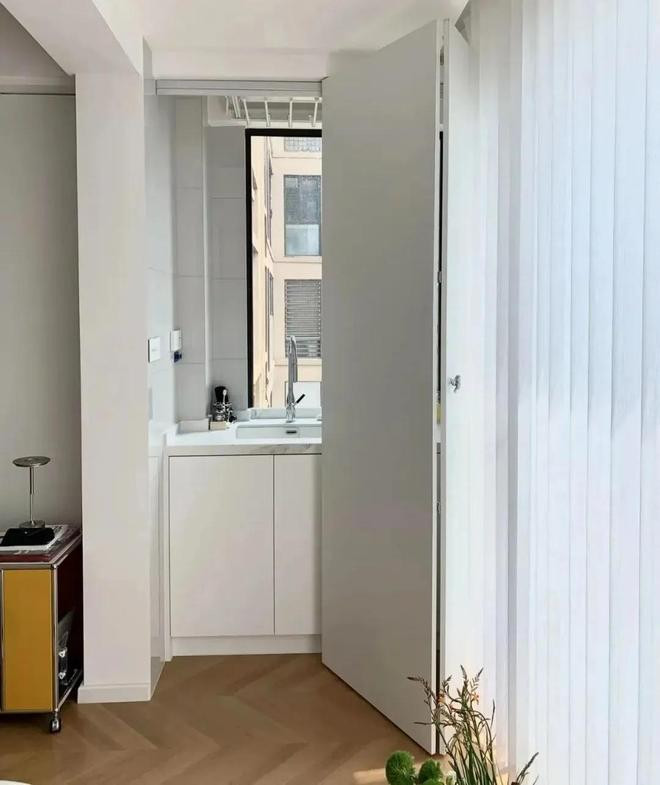 做定制柜里,定做一个折叠柜门,把晾衣区隔在里面,拉上柜门就很隐形了,谁还知道衣服晾在哪啊。